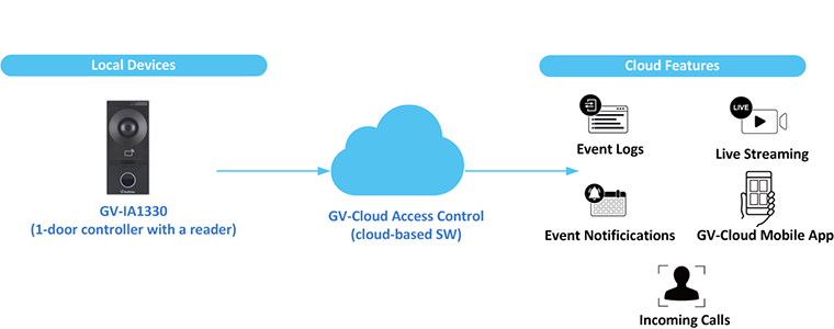 The GV-IA1330 intercom controller features a built-in 2 MP camera and a 13.56 MHz reader. Designed for integration with the GV-Cloud Access Control platform, it enables cloud-based access management for up to 100,000 cards. The camera captures snapshots and streams live video of entry or exit to GV-Cloud Access Control during access events.