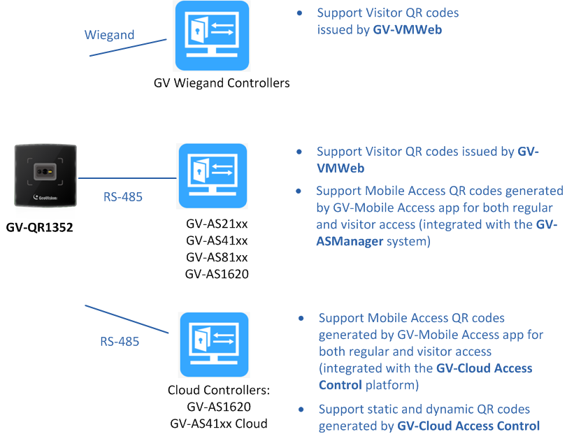 - Support for QR codes (visitor access) and mobile cards (ongoing access) issued via GV-Cloud Access Control