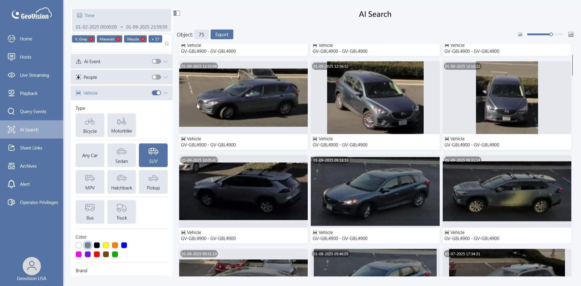 The AI vehicle search identifies specific vehicle types (Sedan, SUV, MPV, Hatchback, Pickup), along with color and make, allowing operators to quickly locate target vehicles. These detailed vehicle attributes enhance search precision and speed.