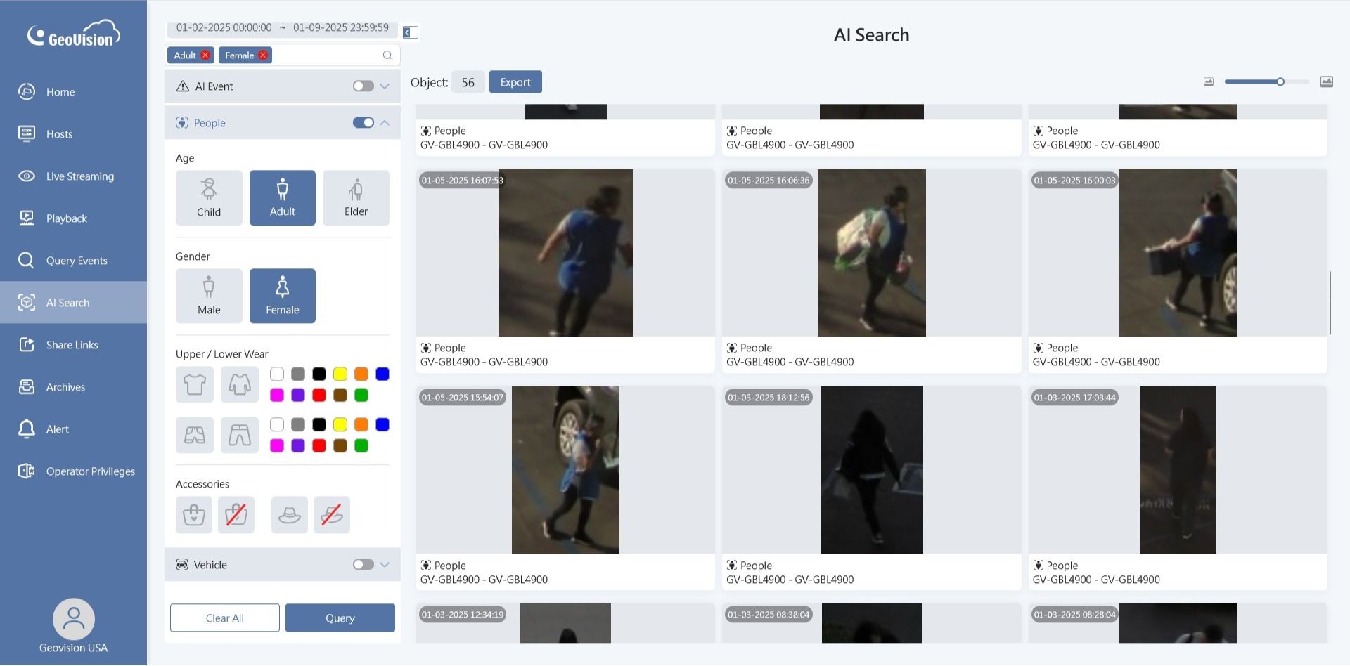 GeoVision AI search allows you to filter by gender, color of clothing, and accessories like hat, bag, face mask, and glasses, making it an invaluable tool for enforcing safety protocols and ensuring secure environments.